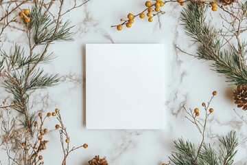 Overhead view of a Christmas style picture frame adorned with holly leaves red berries and golden bells featuring a festive red and green border isolated on a white background
