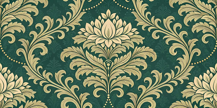Beautiful Damask Pattern with Elegant Floral Motifs and Golden Accents on Emerald Green Background for Sophisticated Interior Design and Textile Applications at Home