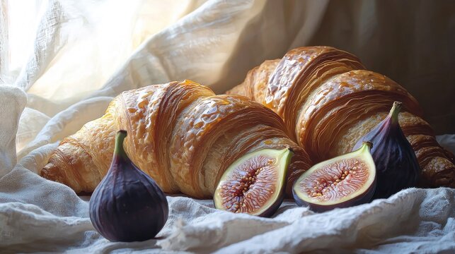 Golden croissants adorned with vibrant edible flowers on a marble surface a delightful culinary scene for breakfast or pastry shop promotion