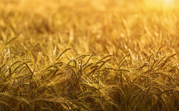 A close-up view of golden wheat crops in a field, illuminated by sunlight.