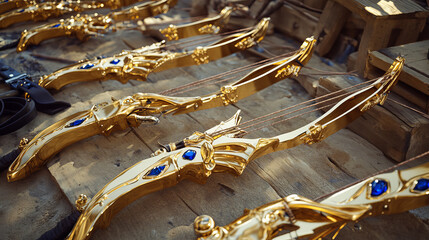 Ornate, golden crossbow with a rich, wooden , presented on a sleek black background.