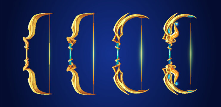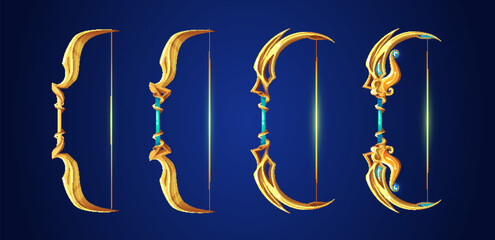 Magic bows game set isolated on background. Vector cartoon illustration of golden weapons with shiny bowstring and handle decorated with blue gemstones, medieval crossbows, hunting tools, game props