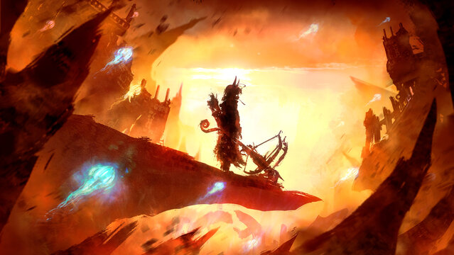 Black silhouette of a little warrior girl in anime style. She is a demon with horns and a huge double-shot crossbow standing on a cliff in the middle of a deserted kingdom of rocks and castles. 2d art