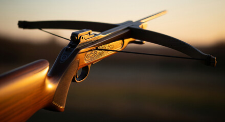 A beautifully detailed close-up of a modern crossbow, with the sun's warm, golden light reflecting off its sleek surfaces