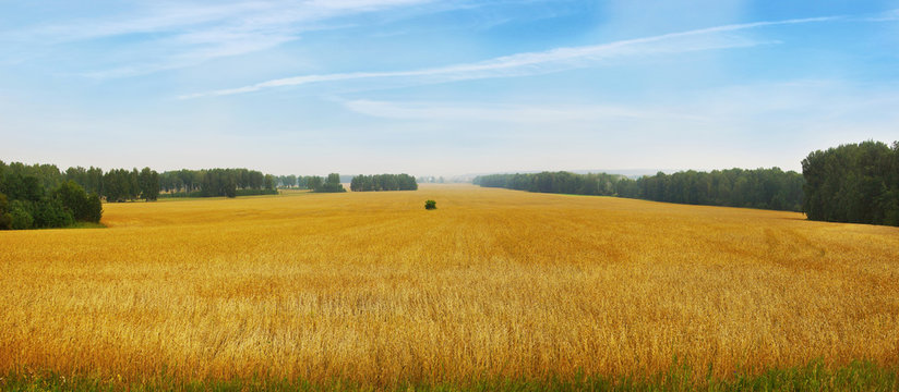 Beautiful landscape with panoramic scenery of golden agricultural field with ripe wheat and blue sky in a sunny day