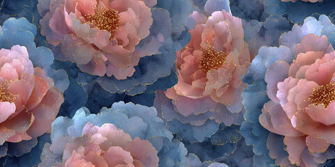 Soft pink flower with blue petals and golden accents create delicate and elegant floral pattern, evoking serene and luxurious atmosphere in this artistic design