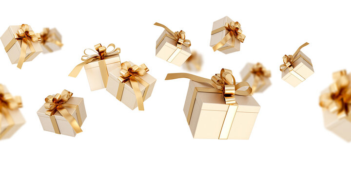 golden gift boxes flying on air isolated on white