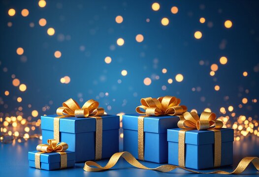 illustration of blue gifts with golden bows and ribbons placed on blue background near stars