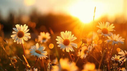 A field of vibrant white daisy blooms stretching towards the horizon, with the warm, golden hues of the setting sun casting a soft, glowing light over the flowers. The background features a blurred