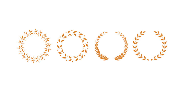 Collection of round golden frames from laurel branches with foliage. Vector illustration