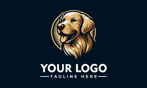 A golden retriever dog logo, smiling, set within a circular frame, on a dark background.