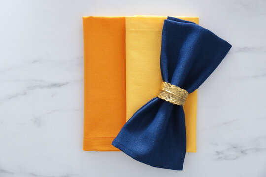 Colorful napkins and decorative ring on white marble table, top view