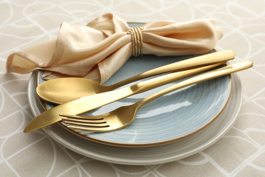 Stylish setting with cutlery, plates, napkin and glasses on table, top view. Space for text
