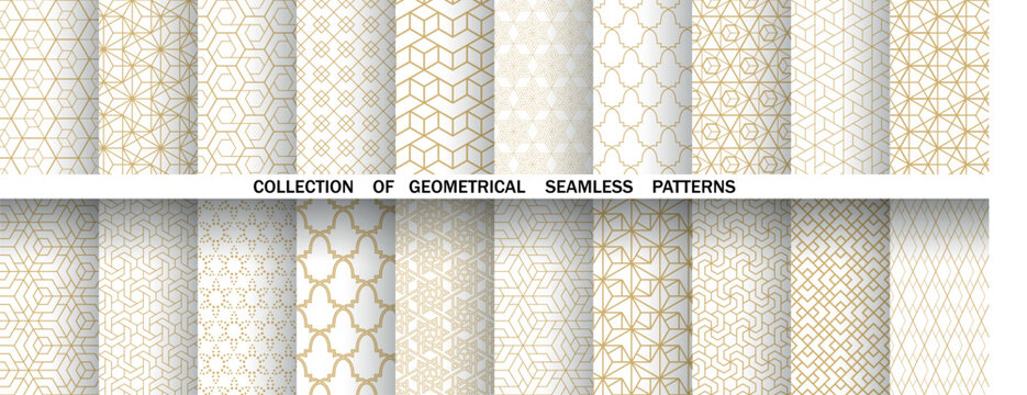 Geometric set of seamless golden and white patterns. Simple vector graphics