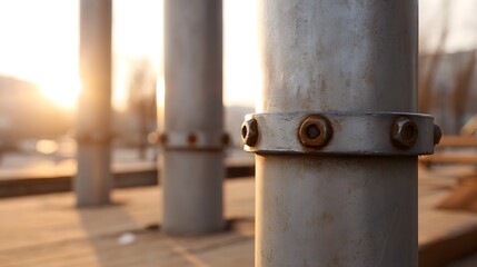 Close up of a weathered metal pole with bolted flange against a warm sunlit background
