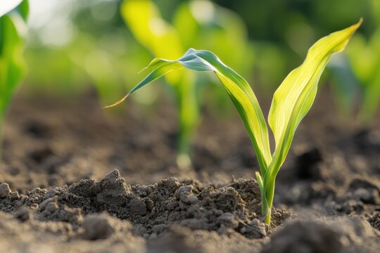 Corn shoot emerges from cracked dry soil, symbolizing hope amid adversity with warm gold tones and a guiding golden rule line