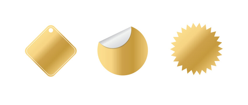 Set of gold sunburst stickers. Price tags with zig zag, scallop, wavy edges. Kit of badges, stamps, labels, speech bubbles isolated on white background.
