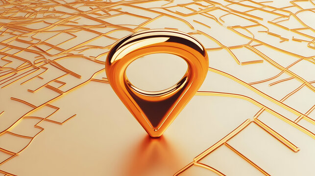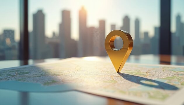 Golden map pin marker on city map table. Modern urban planner office background with blurred skyscrapers. Represents travel planning, navigation, business destination, real estate.