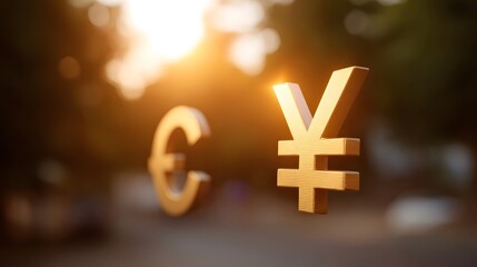 Golden Euro and Yen currency symbols illuminated by warm sunlight representing global finance and economic exchange