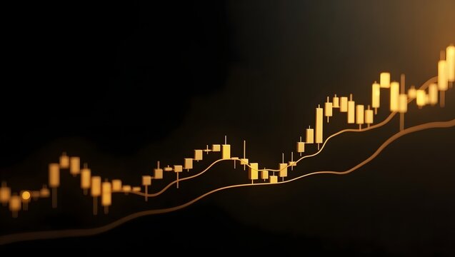 A minimalist and luxurious gold themed stock market scene with glowing golden candlestick charts on a dark background, reflecting on a glossy surface.