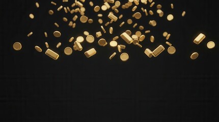 Golden coins and currency falling from above on a dark black background, symbolizing wealth and financial success.