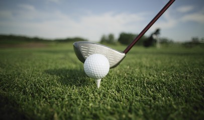 Golf club and golf ball on tee onto the green grass ready to be shot.