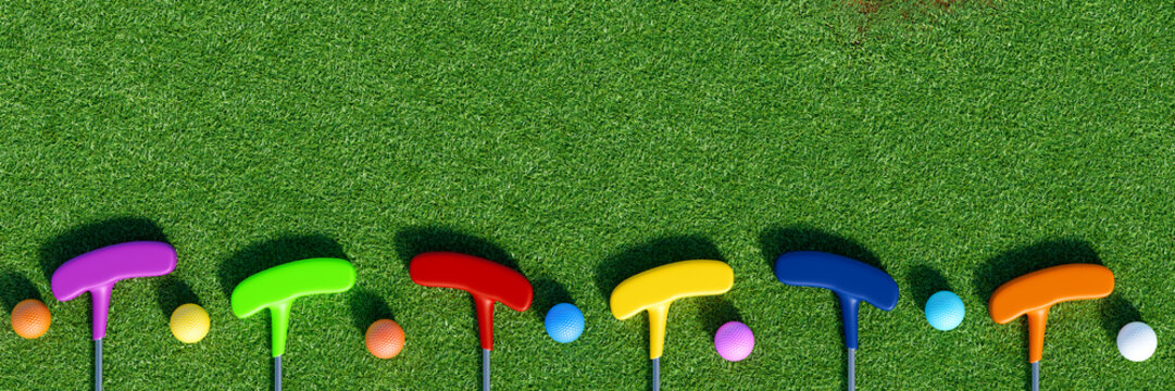 Colorful mini golf balls and clubs on green grass