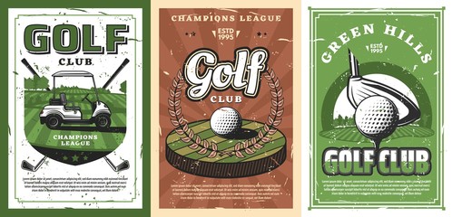 Golf clubs, balls and cart on cource green field