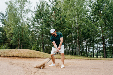 Golfer exhibiting perfect swing in sandy bunker at tournament