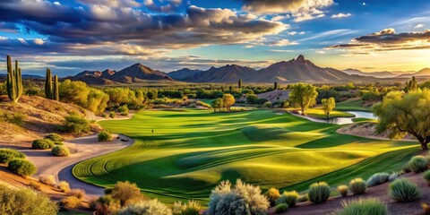 Beautiful golf course in the desert at sunset, beautiful landscape