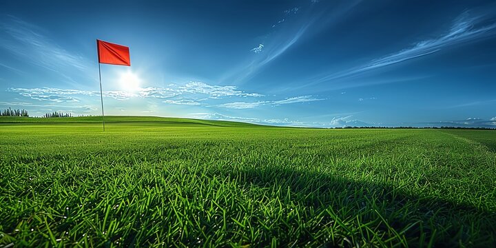 Vibrant green golf course with a red flag under a clear blue sky, perfect for outdoor sports enthusiasts.