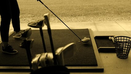 Golfer Practice Golf Swing with Her Driver in Driving Range and a Golf Bag with Golf Club in Switzerland.