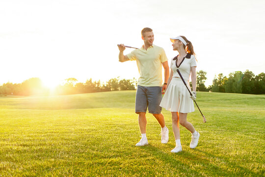 young sports couple in uniform playing golf together on field with lawn at sunset, woman with instructor practicing golf competitions and having active recreation