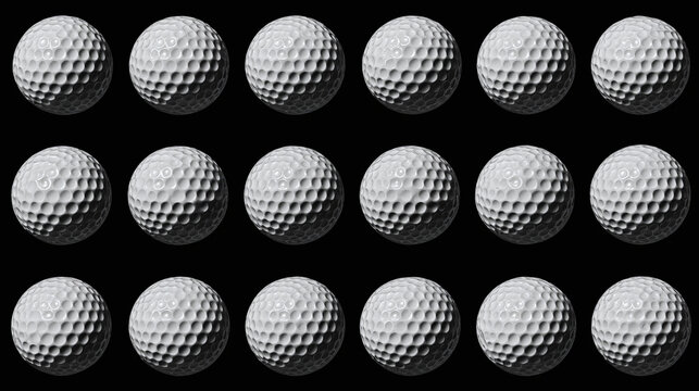 A series of golf balls in a dark background, the golf balls arranged in a grid-like pattern. Each sphere has dimples