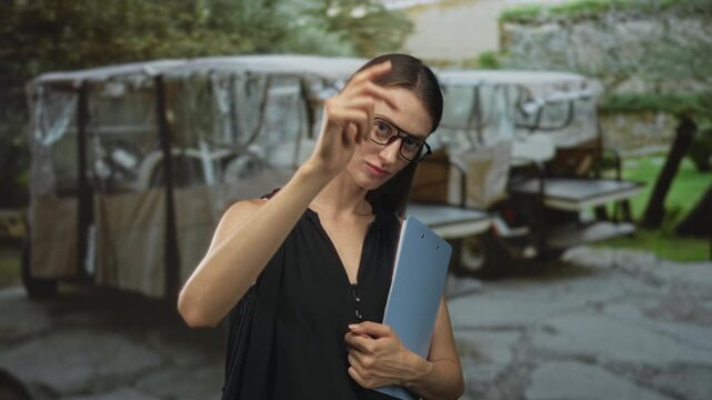 Woman wearing glasses points finger at camera while holding blue clipboard and standing on street near parked golf cart and trees; confidence leadership.