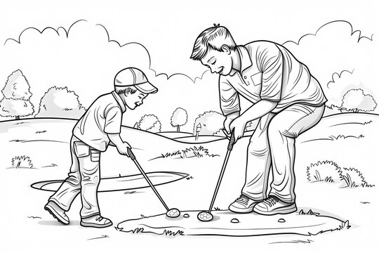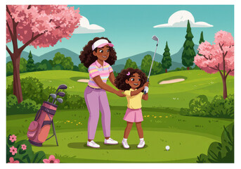african american mother teaching daughter to play golf on sunny day. lush green course, pink flowering trees surrounding. fun family activity, bonding, outdoors summer leisure illustration