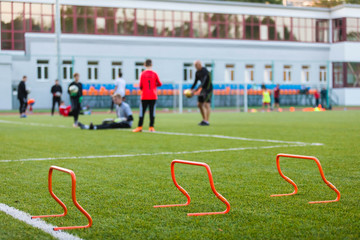 The sports equipment in the form of gate for a training of football players costs on the football green field. football players on a background
