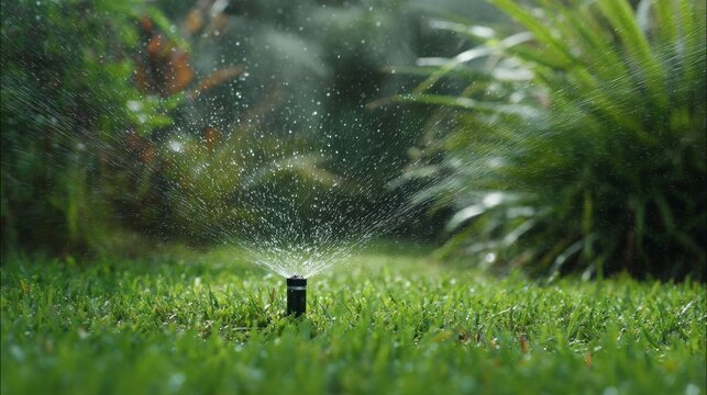 Close up automatic sprinkler watering lush green lawn, creating refreshing summer garden environment with hydrating spray