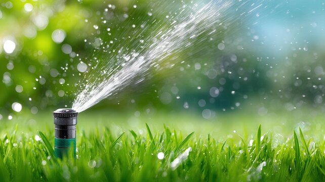 Close up automatic sprinkler watering lush green lawn, creating refreshing summer garden environment with hydrating spray