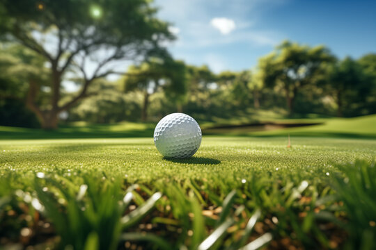 Golf ball on grass. Land for playing golf. Golf sport. Golf competition.