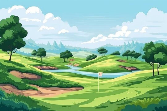 golfing session flat design front view golf course theme cartoon drawing colored pastel