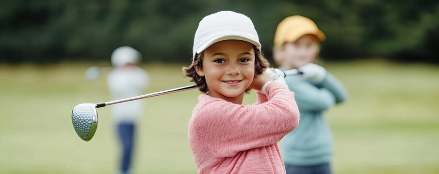 Children practicing golf swings, echoing future precision, early training in technique