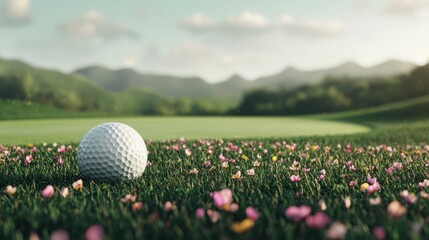 A close-up of a golf ball resting on grassy terrain adorned with flowers, set against a tranquil landscape of hills and soft clouds.