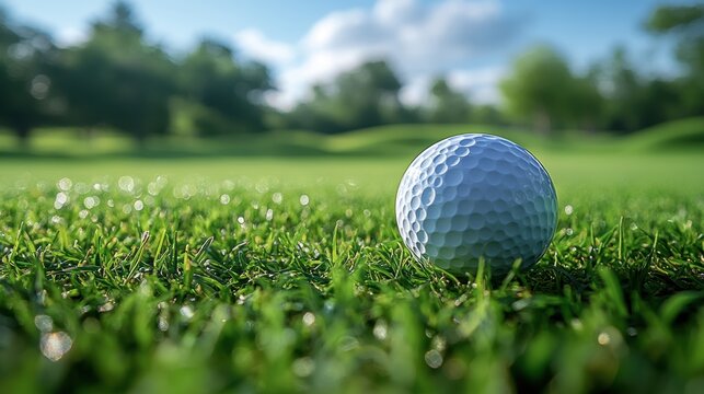 A close-up of a golf ball resting on the green grass of a golf course under a bright blue sky. The crisp details and natural lighting highlight the sport’s precision, outdoor beauty, and competitive s