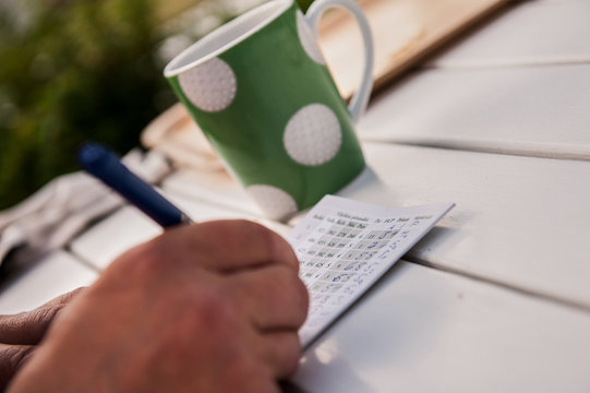 Filling a score card in golf while having a coffee