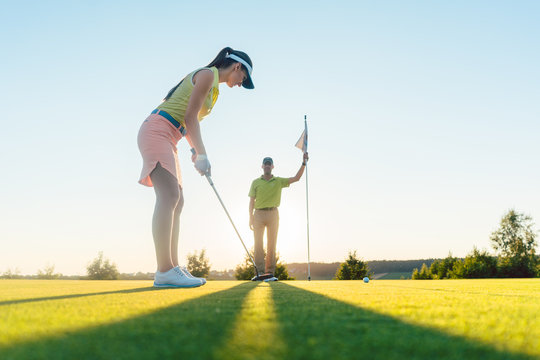 Frau auf dem Golfplatz übt Putting mit dem Golf Lehrer
