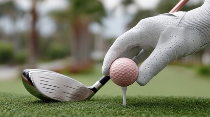 Golfer prepares to tee off on sunny course with glove and club