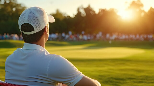 A golfer enjoying a scenic sunset view over the golf course, surrounded by a vibrant crowd of passionate fans.