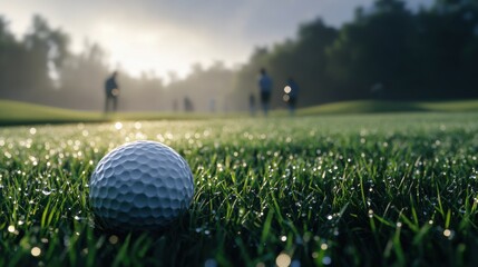 A close-up of a golf ball with dew on grass, surrounded by golfers in the background during early morning light.