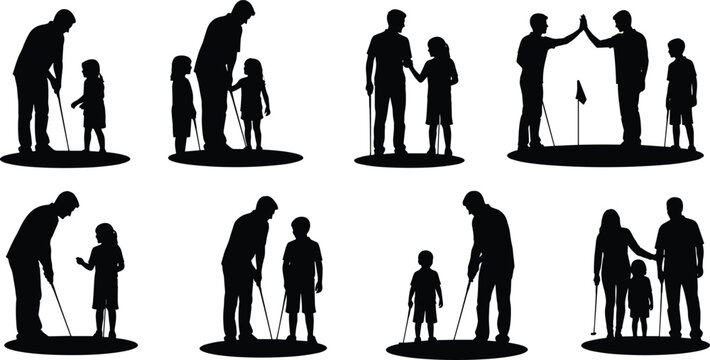 Family golf silhouette, father teaching child, kids learning golf, outdoor sports activity, golfing lifestyle, parent child bonding, golf practice, teamwork, fun